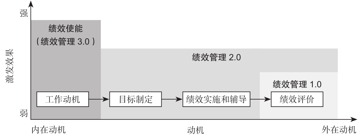 前已述及,绩效使能瞄准的是员工的内在动机的激发,这是绩效使能与传统绩效管理最大的区别。如果将绩效使能(也即绩效管理3.0),与传统绩效管理(绩效管理2.0)、绩效评价(绩效管理1.0)放在一张图里,那么它应该如图2-6所示。