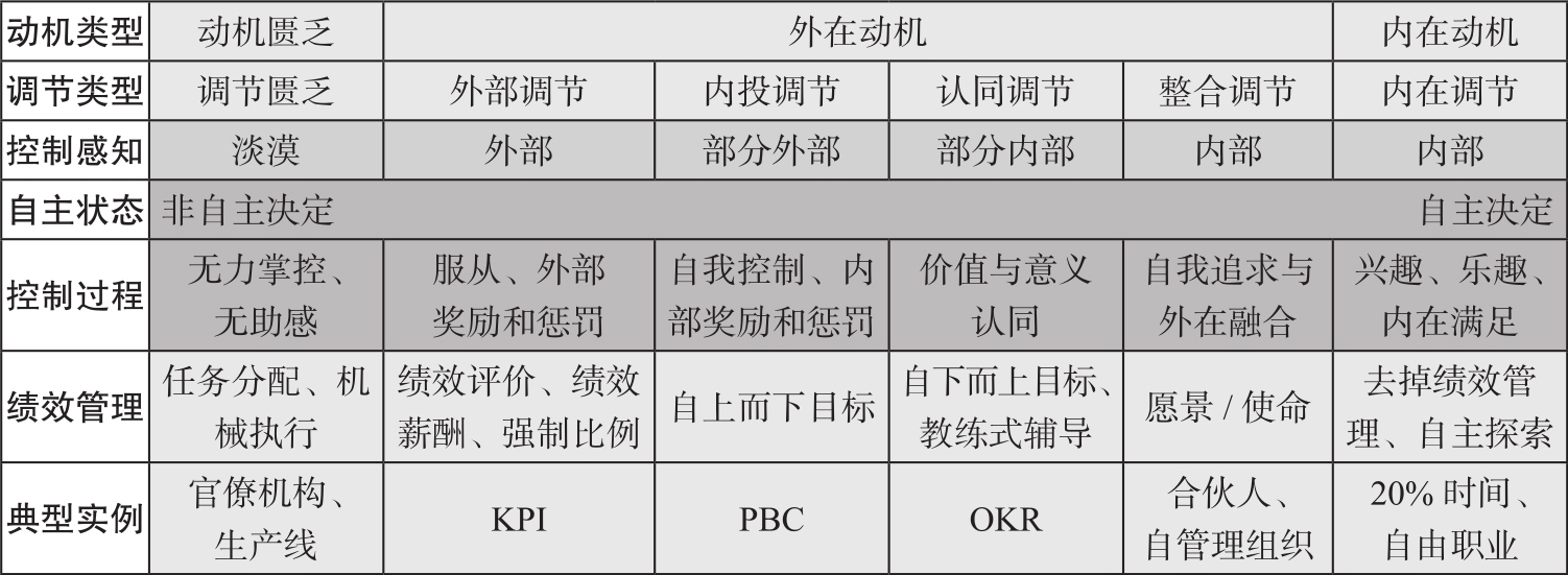 如果能完全废除绩效评价,以及伴随而来的强绩效应用,不加束缚地允许员工进行自主探索,那么,员工的动机水平就可以达到最好的状态,即内在动机状态。内在动机是一种基于兴趣和爱好自主做事的状态,事情本身一定是有趣且好玩的,而且员工的自主、胜任和关系三个基本心理需求得到了最大程度的满足。
