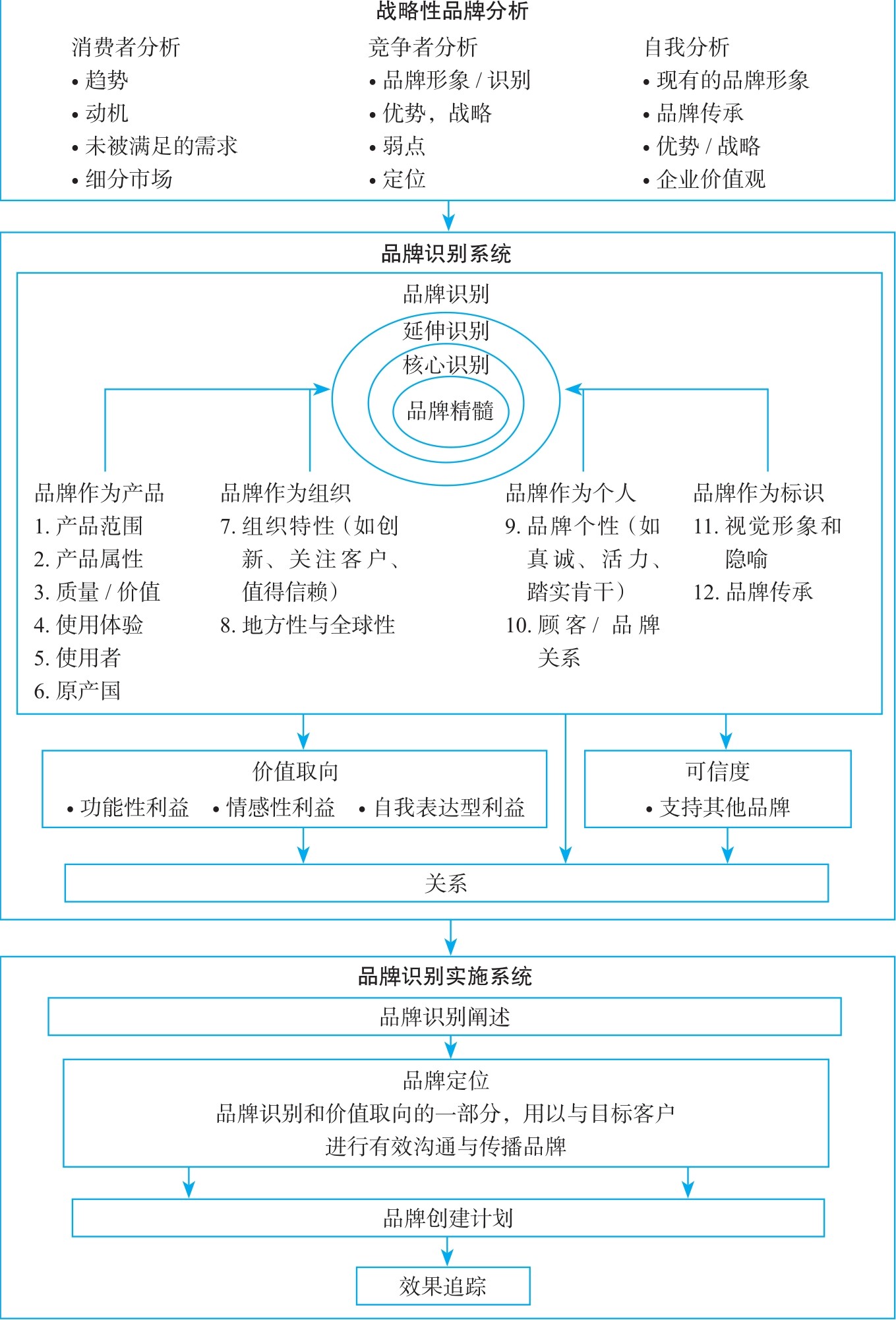 我们还需要注意的是品牌识别结构包括核心识别、延伸识别和品牌精髓。一般而言,品牌识别需要6~12项要素才能较为充分地描述出品牌意象。通常要囊括这么多的要素是很难处理的,因此确认核心识别(品牌识别中最重要的元素)有助于提高对品牌识别的聚焦。核心识别的所有要素都应能够反映企业的战略和价值导向,并且至少要有一个要素能区分品牌的关联并能够与消费者产生共鸣。当品牌延伸到新市场和新产品时,核心识别是最有可能延续和保持的。如果顾客是根据核心识别来认识品牌的,那么这场竞争就赢了。