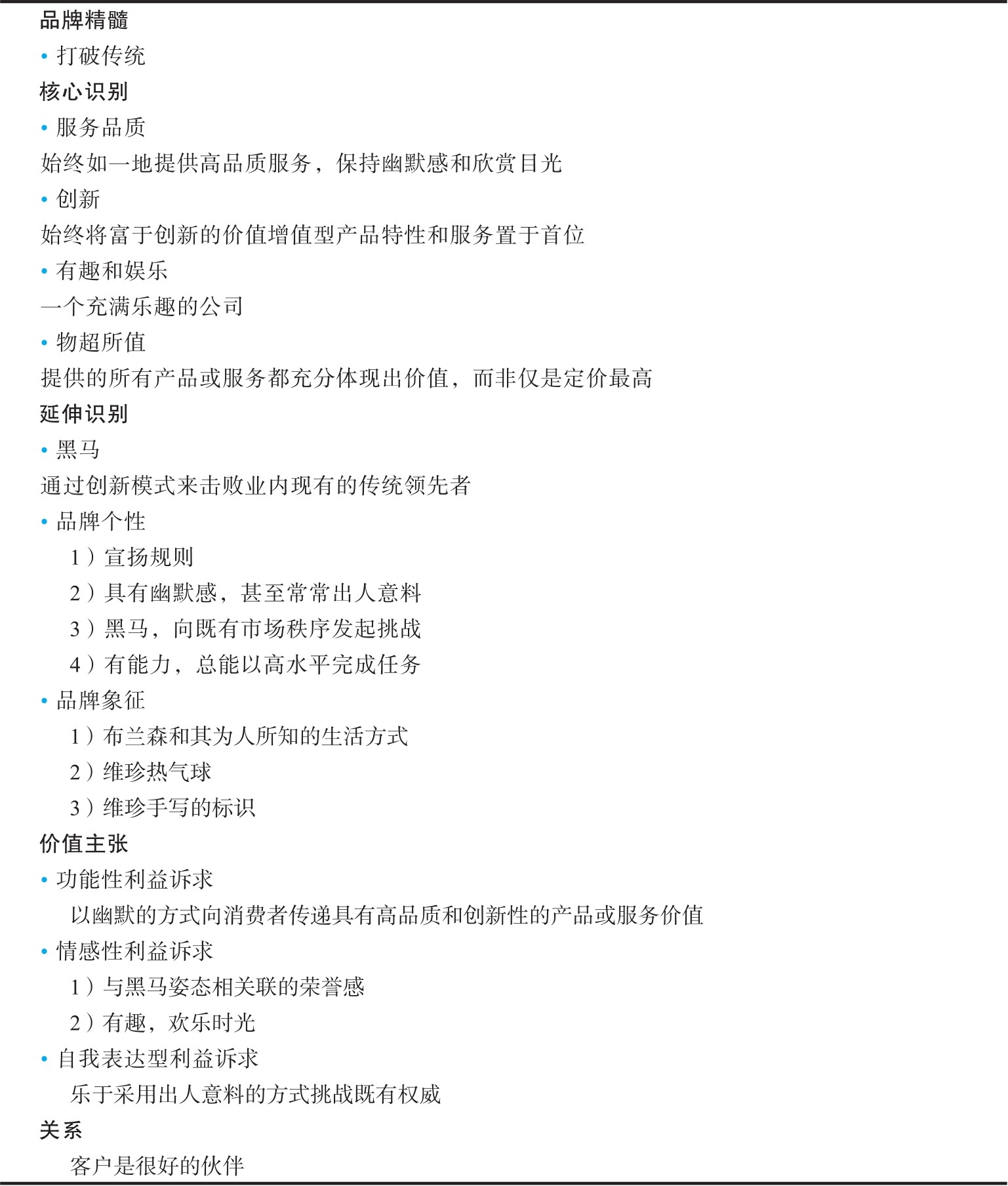 表2-1展示了维珍的品牌识别。其核心识别包含四个概念——服务品质、创新、有趣和娱乐、物超所值。延伸识别强化了其“黑马”地位、品牌个性和品牌象征。