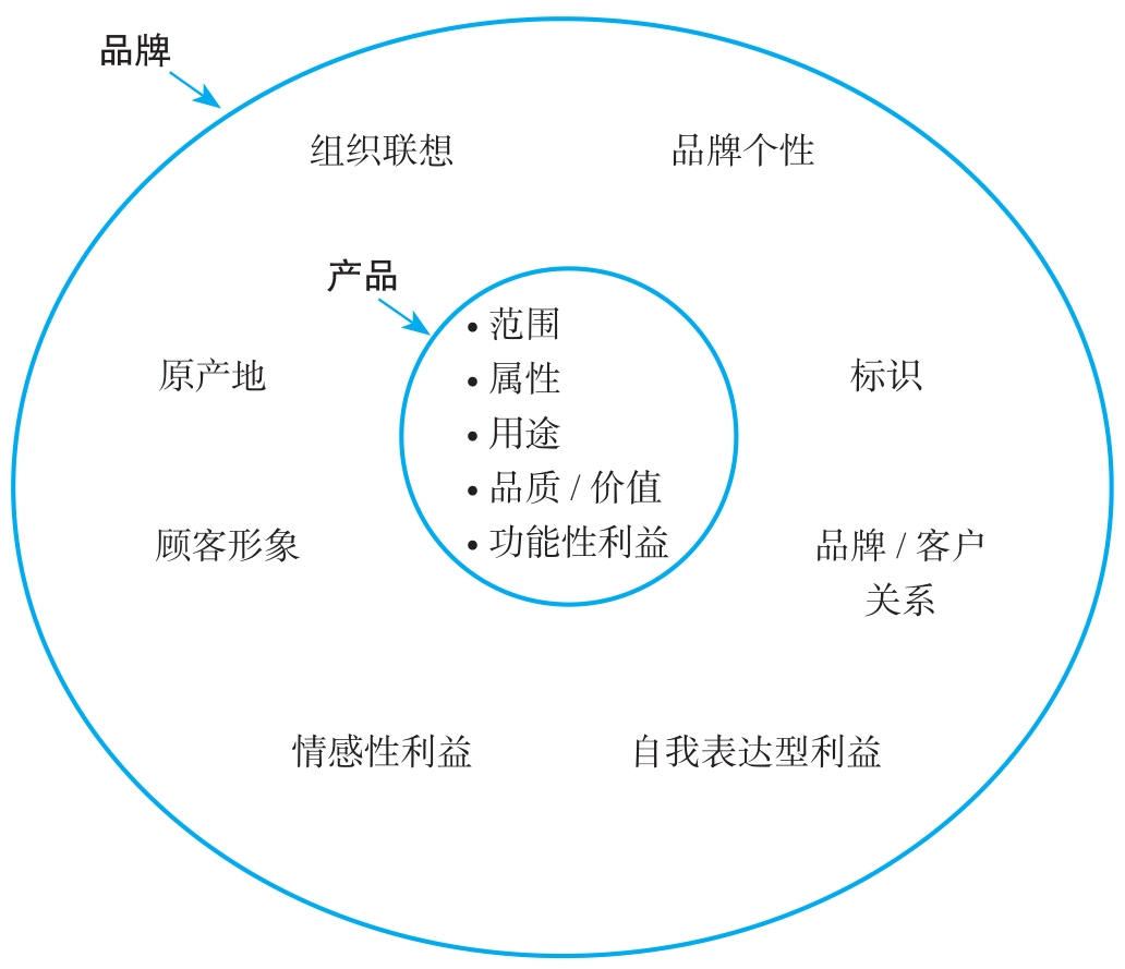 图2-4总结了产品和品牌的差别。产品包括许多特性,如产品范围(佳洁士制造的是牙齿的卫生保健产品)、产品属性(时尚杂志有最新的时尚信息)、品质/价值(卡夫交付给顾客高质量产品)、用途(斯巴鲁汽车专用于雪地行驶)和功能性利益(沃尔玛提供超值服务)。品牌包括了所有这些产品特性,而且还远远不止这些,它还包括以下内容。