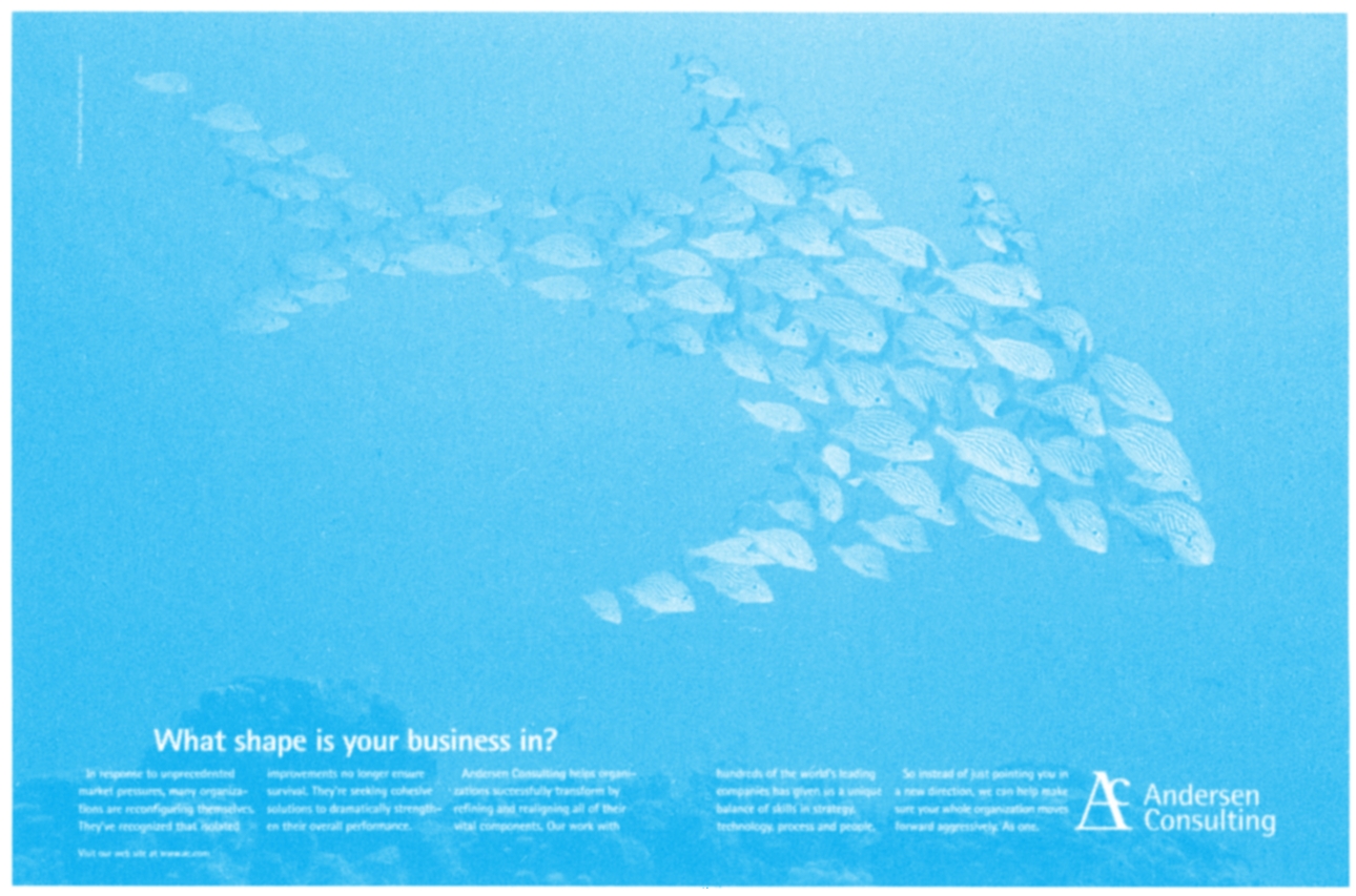 强有力的视觉标识可以用生动而深刻的方式来解释复杂的功能性利益。安达信咨询公司的经营理念是“全面系统地考察整个组织一定会有不同的收获”,而许多同行企业却仅能依靠对某些特殊问题(这些问题通常是更深层次问题的表象反映)的考察来对目标组织进行单一方面的改善。安达信的广告代理商扬罗必凯广告公司(Young & Rubicam),设计了一系列反映公司这一经营理念的视觉标识,并从1995年起在此基础上发动了一场全球广告攻势。广告活动中的一个标识作品是一只海龟向上吸附了一些空气阻流板,这是表现企业目光短浅的典范。另外一个标识作品如图2-5所示,图中一群鱼相互协作,构成一个巨大的鲨鱼画面。这些视觉标识不仅有震撼力,而且文化和语言是相对独立的,有助于将信息传遍世界。