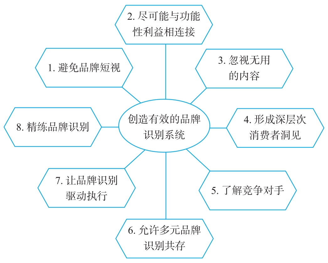 通过对开发和帮助他人开发品牌识别的一手资料进行分析总结,我们提出发展品牌识别系统所需要遵循的八项原则(见图2-3)并详述如下。你在阅读的同时,请重点关注那些与你企业的品牌建设相关的内容及建议。