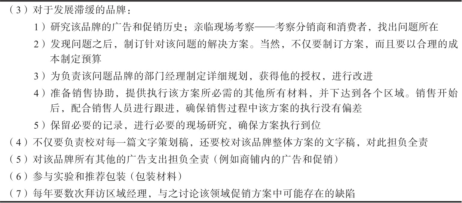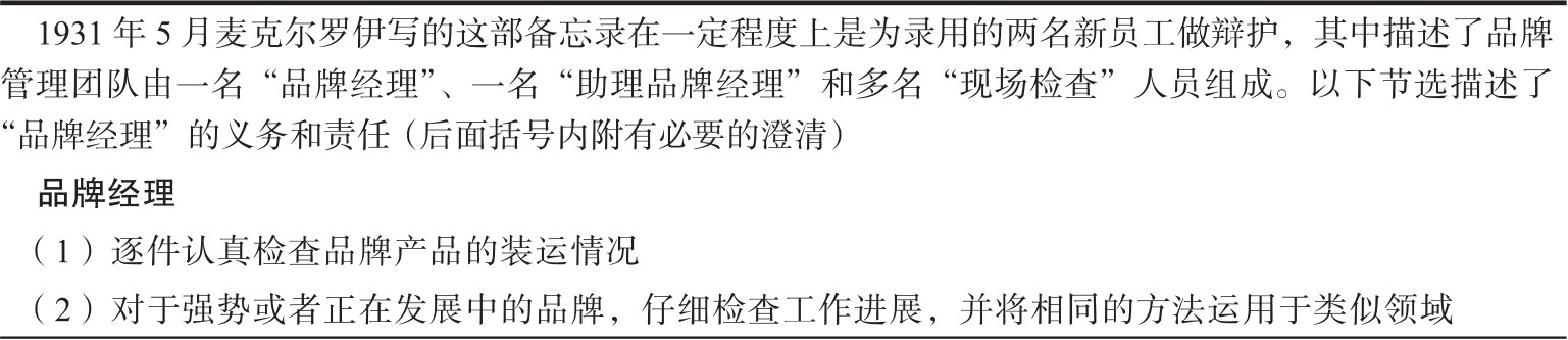麦克尔罗伊的《品牌管理备忘录》(见表1-1,节选)详细地阐述了问题的解决方案——建立品牌管理小组。该备忘录指出,一个品牌的管理团队必须负责品牌营销计划的制订并保证计划能与制造和销售相统一。这个基于宝洁公司内部和外部很多人的理念与实践总结而成的备忘录,后来对于全球的企业如何去管理自己的品牌产生了深远的影响。