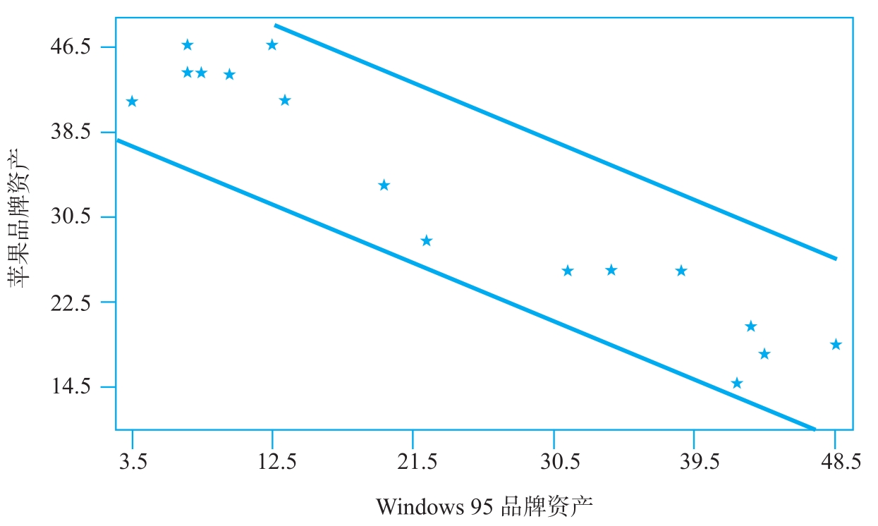 ● 竞争对手行为。惠普的品牌资产曾经历了急剧下跌,这在一定程度上就是受到了其竞争对手佳能猛烈广告攻势的影响。Windows 95对苹果品牌资产的影响也是十分巨大的(见图1-4),Windows 95品牌资产的提升以及它对苹果的用户友好界面的压制,都是该影响的体现。事实上,这一结果正是微软所要达到的战略和战术目标。