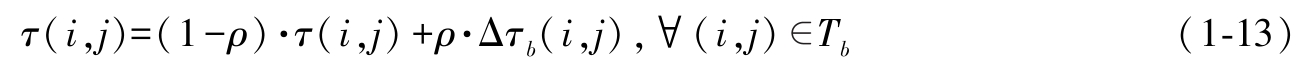 其中,Δ τ b ( i , j )=1 /C b , C b 为至今最优路径长度。值得注意的是,在ACS的全局更新中,只有至今最优路径 T b 上的边才有信息素蒸发和释放。