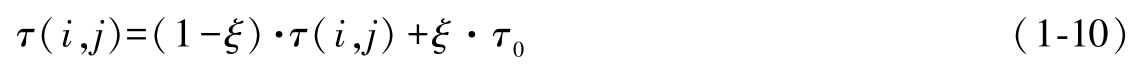 3)信息素局部更新 :传统的AS算法只有全局信息素更新。ACS算法中引入了一种信息素更新方式,蚂蚁每经过一条路径,就减少那条路径上的信息素,避免同一条路径被重复选择,从而提高算法的探索能力。信息素局部更新如式(1-10)所示。