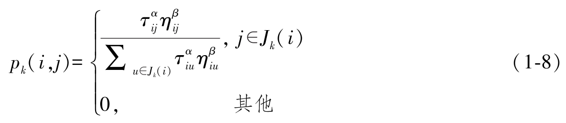 ●随机比例规则:每只蚂蚁 k 在节点 i 上,按照伪随机比例选择规则,依次在待访问节点集合 J k ( i )中选择下一个节点 j ,逐步构建生成解。随机比例 p k ( i , j )由信息素 τ ij 和启发式信息 η ij 的加权乘积求得,即