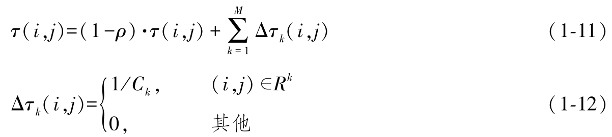 其中,参数 ρ 代表信息素蒸发的速率,规定0< ρ ≤1, R k 是第 k 只蚂蚁构建的路径的边集合,Δ τ k ( i , j )是第 k 只蚂蚁在它经过的边上释放的信息素, C k 是蚂蚁构建的路径长度。