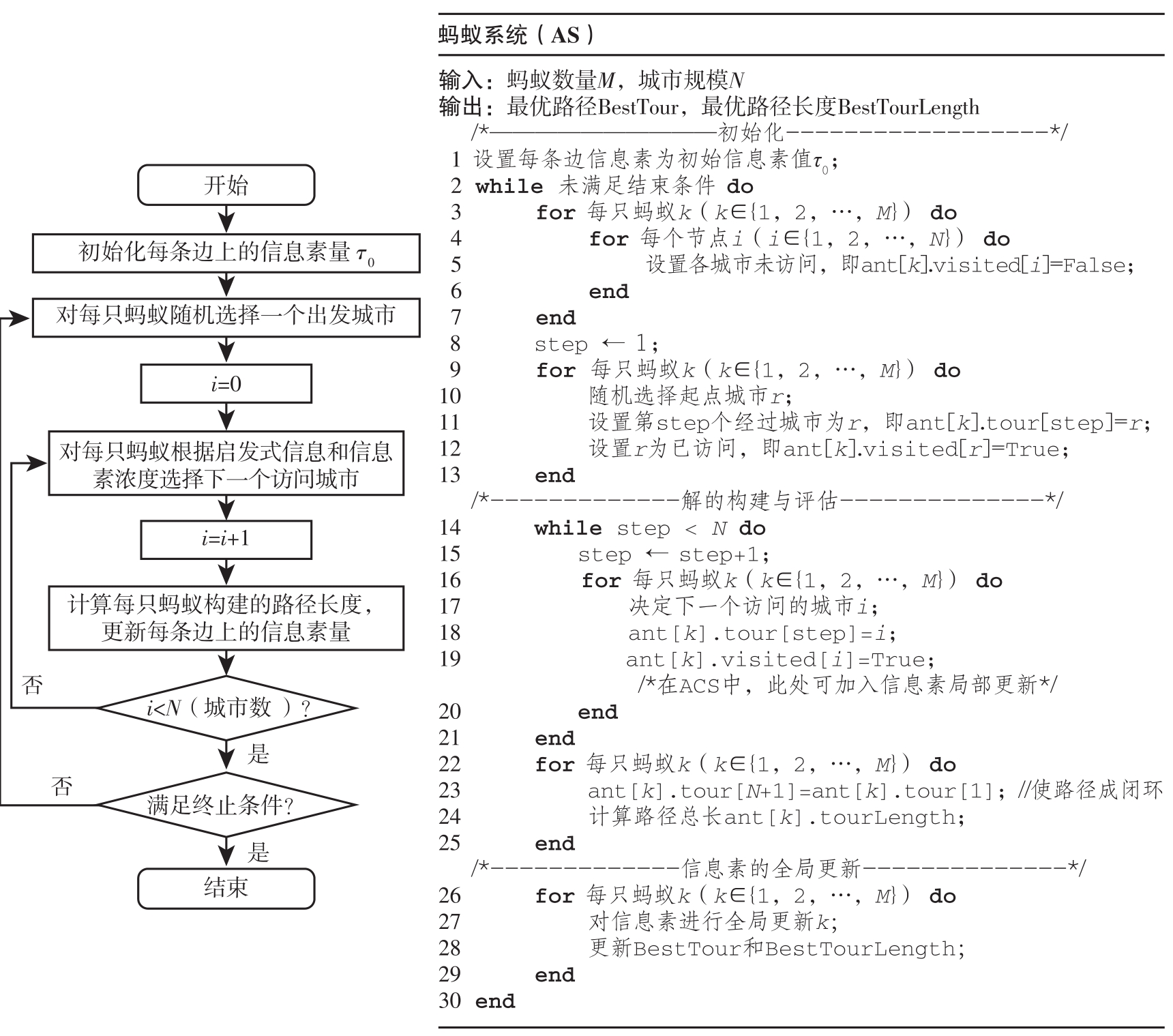 蚁群优化算法的初级版本AS求解TSP的流程图和伪代码如图1-17所示。在AS的基础上,我们还将介绍蚁群优化算法的重要改进版本ACS。相比AS而言,ACS主要有以下3大改进,提高了算法的探索和开发能力。