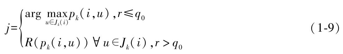 ●伪随机比例规则:在上述随机比例规则的基础上,伪随机比例规则在构建解的每一步,以 q 0 的概率,选择最大的伪随机比例 p k ( i , j )对应的节点 j 作为下一个节点,以1 -q 0 的概率,按照伪随机选择比例 p k ( i , j )进行轮盘赌选择,确定下一个节点 j ,即
