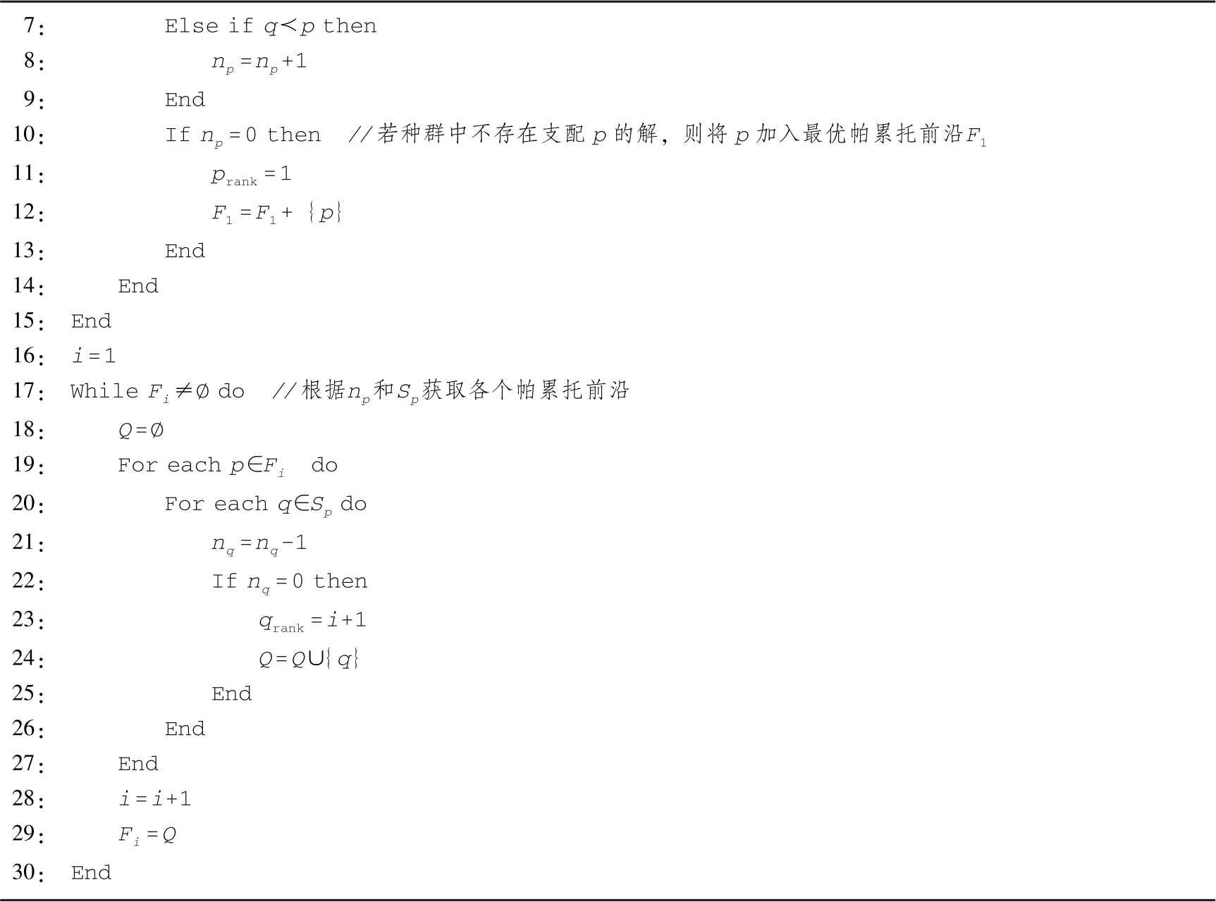 目前,大部分多目标进化算法利用帕累托支配关系判断候选解的优劣,其中最具代表性的是改进后的非支配排序遗传算法(Non-dominated Sorting Genetic Algorithm Ⅱ,NSGA-Ⅱ),又被称为快速精英多目标遗传算法。在遗传算法的基础上,NSGA-Ⅱ使用了快速非支配排序方法加速种群选择,基于个体拥挤距离选择算子保留种群多样性,精英策略选择算子帮助种群寻优。快速非支配排序方法通过记录每个候选解 p 被支配的个数( n p )以及每个候选解 p 支配的候选解集合( S p )来辅助快速排序的完成。在 n p 和 S p 的帮助下,每个解决方案只需要在每次迭代中与种群中的其他解决方案进行一次比较,确定支配关系即可。