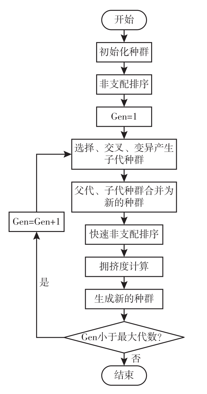 NSGA-Ⅱ根据支配关系和个体拥挤距离选择优质父代产生子代,并保留精英个体,主要包括快速非支配排序和拥挤度计算两大步骤,NSGA-Ⅱ流程图如图2-2所示。
