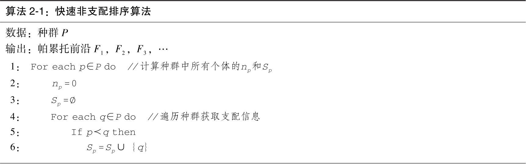 1)快速非支配排序 :首先,快速非支配排序方法为每个个体计算两个变量:支配计数( n p ),即支配该个体的数量;该个体支配的集合( S p )。首先,该方法通过循环比较找到所有 n p =0的个体,并将其放入第一层非支配前沿中。其次,对于第一层非支配前沿中的个体,使用快速非支配排序方法访问其支配集合中的每个个体,并将其支配数减少一个。在此过程中,如果有个体的 n p =0,则将其放入下一个非支配前沿。然后对下一个非支配前沿中的个体进行上述操作,并确定第三个非支配前沿。重复上述过程直到获得所有前沿。快速非支配排序算法的伪代码如算法2-1所示。