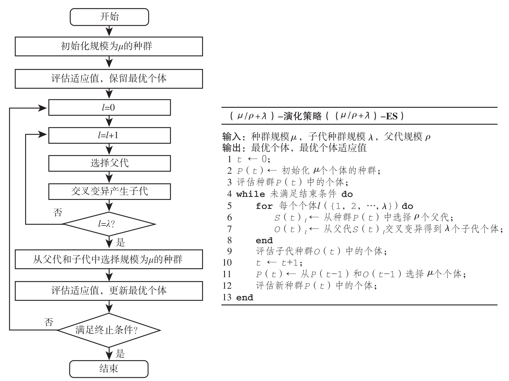 图1-6 演化策略的流程图和伪代码
