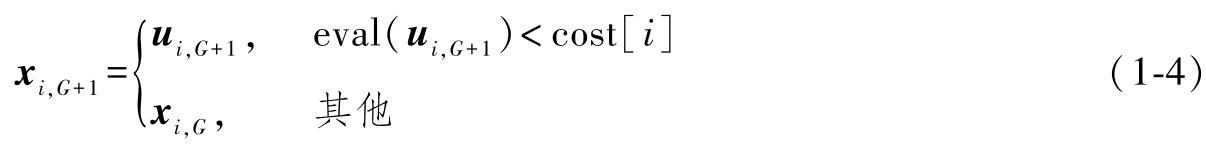 其中,eval( u i , G +1 )是评估试验向量 u i , G +1 的适应值,cost[ i ]则是原种群中向量 x i , G 的适应值,即如果 u i , G +1 优于原种群中的向量 x i , G ,则在新种群中用前者取代后者,否则新种群中的向量沿用原种群中的向量 x i , G 。