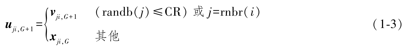 式(1-3)中randb( j )是第 j 个[0,1]之间的随机数,CR是[0,1]之间的交叉率,由用户决定,rnbr( i )是随机选中的{1,2,…, D }中的一个下标,以确保试验向量 u i , G +1 从变异后的向量 v i , G +1 中至少获得一个参数。