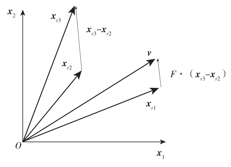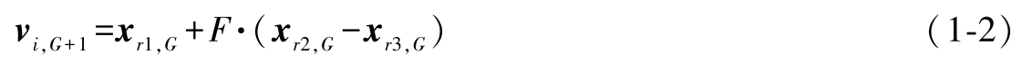 1)变异算子 :如图1-12所示,差分进化算法通过两个种群向量的加权差分向量与第三个向量之间的和来产生新的向量,而不像遗传算法依靠随机产生新的基因。记第 G 次迭代中,规模为NP的种群中向量为 x { i , G } , i =1,2,3,…,NP,则变异后的向量根据式(1-2)产生