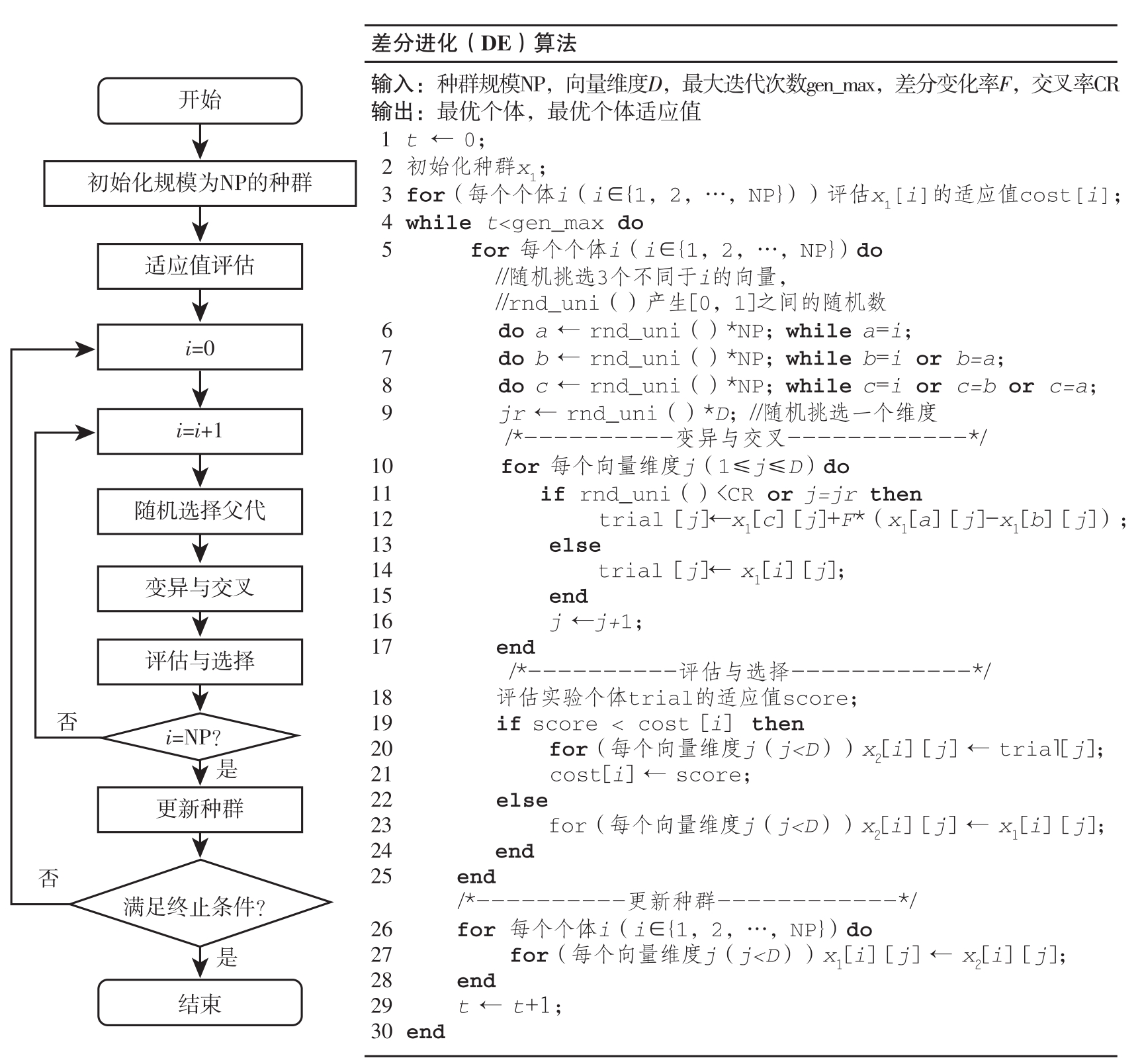 考虑一个维度为 D 的最小化目标函数值的问题,差分进化算法的流程图和伪代码如图1-11所示。