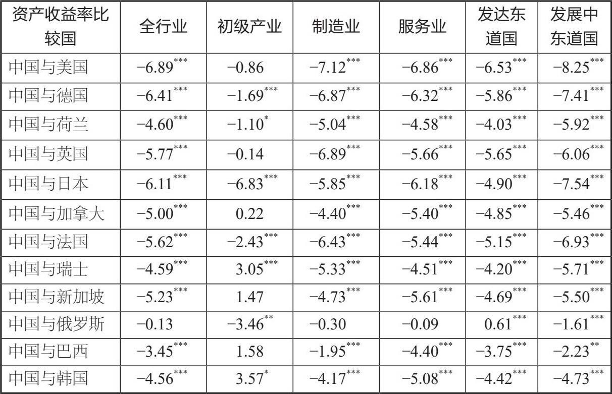 表2—5 2006—2017年中国与其他主要对外直接投资国海外子公司资产收益率差距