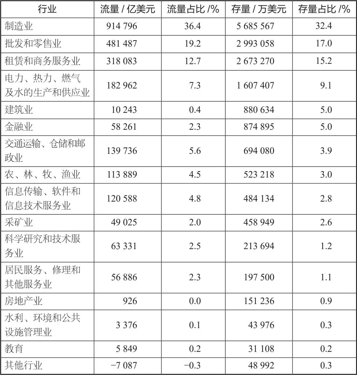 联合国贸易和发展会议(UNCTAD)发布的《2021世界投资报告》统计数据显示,2020年中国对外直接投资总量实现历史性突破,以1 537亿美元的规模首次位居全球首位,较上年增长幅度达12.3%。从全球份额看,中国对外直接投资流量占比从2012年的6.3%逐年攀升,至2020年已占据全球总量的五分之一(20.2%),这一增长轨迹显著体现了中国在全球资本流动格局中的驱动作用。以2023年中国对东盟地区的投资为例,制造业仍然是中国企业最主要的投资领域,相关投资占中国对东盟总投资的32.4%。随着中国制造业不断升级,向智能化和绿色化转型,制造业引领着中国企业在东盟各国的投资持续提升。紧随其后的是批发和零售业,相关投资占投资额的17%,体现了中国企业在东南亚市场,尤其是在跨境电商等领域的强大竞争力(见表3—1)。此外,租赁和商务服务业、信息传输与技术服务业等领域的投资也呈现快速增长趋势,特别是在高科技和服务业的国际化发展上,中国企业的布局愈加广泛。再以非洲为例,中国在非洲的投资也逐年增加,虽然流量不大,2023年的投资仅占总投资流量的2.2%,但同比增速是“一带一路”区域中最快的(118.8%)。