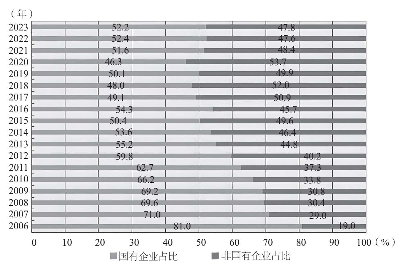 图3—2 2006—2023年中国国有企业和非国有企业投资存量占比情况