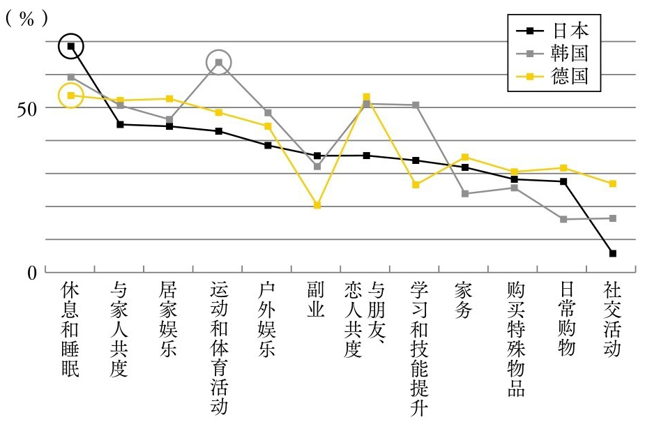 图1-4显示的是当被问及“如果私人时间变多,最想做什么”时,日本人、德国人和韩国人的回答数据。