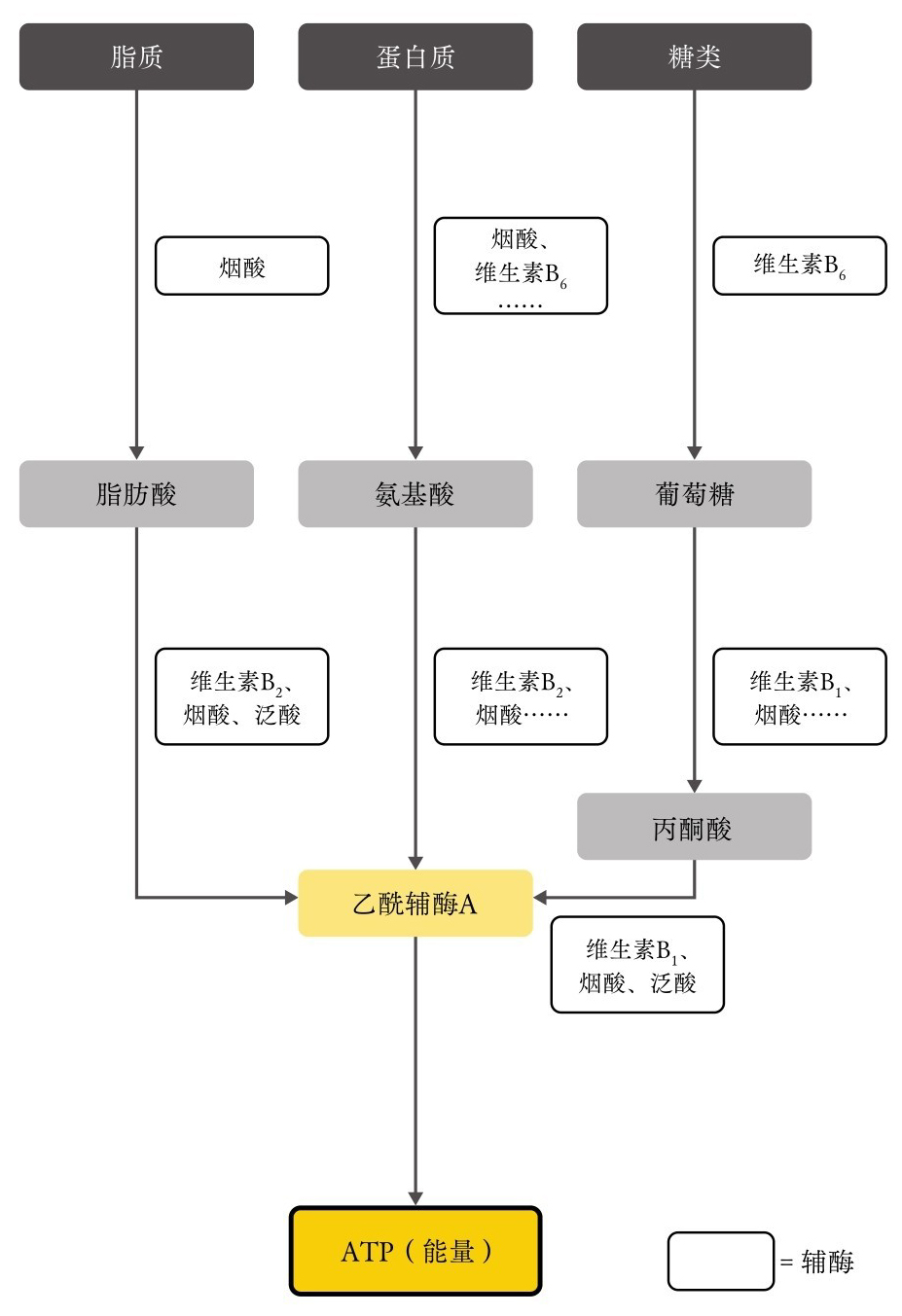 但在这个过程中,合成乙酰辅酶A需要B族维生素等多种营养元素的参与,这些物质被称为“辅酶”。虽然脂质、蛋白质和糖类是ATP的原材料,但没有维生素和矿物质也无法生成乙酰辅酶A。因此, 脂质、蛋白质、糖类与维生素、矿物质被称为五大营养元素。