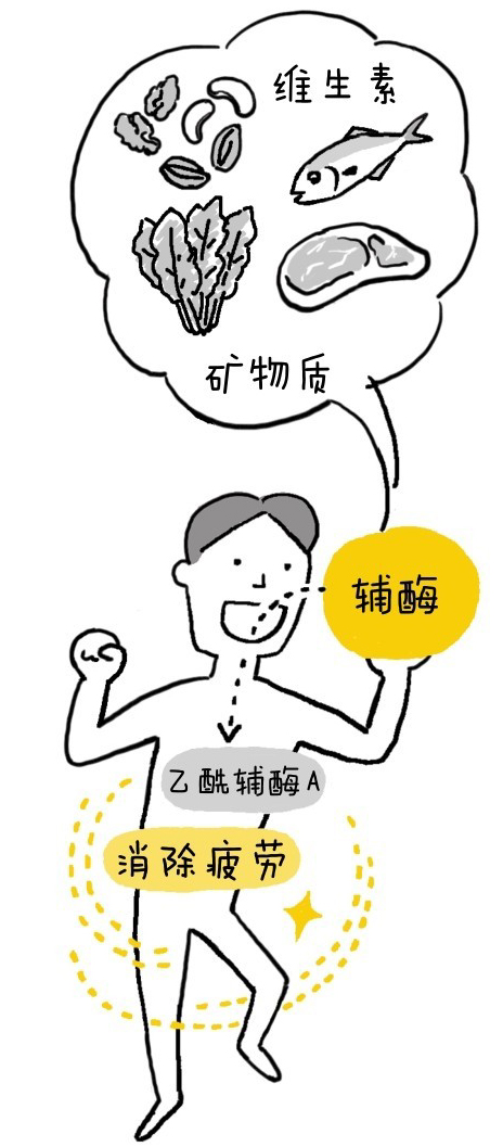 但是,还需要再强调一遍,如果没有辅酶,就无法产生乙酰辅酶A。如果无法产生ATP,细胞就无法修复,疲劳也就无法消除。要消除疲劳,就必须在摄入蛋白质的同时摄入维生素和矿物质。一言以蔽之, 要想缓解疲劳,最重要的就是要保证饮食的营养均衡。