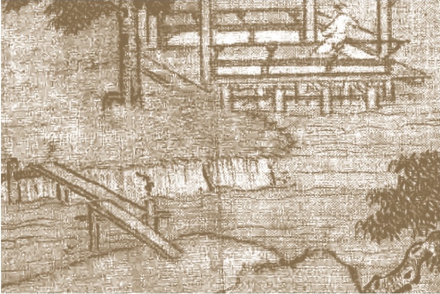 栈架若是与岸等高,便是平桥(图4),若是高于河岸,便形成两坡的折桥(图5)。若多榀栈架中间高两边低,渐次变化,桥面形成多段折线,便叫“虹桥”。有时人们也会用形曲木材来强调这种弧拱,如汴梁城金明池中的“仙桥”——“骆驼虹”
