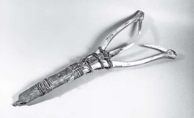 图3―1 奈特斯利克地区用来捕鱼的鱼叉头部。鱼叉头部是用驯鹿的角制作的。1903―1906年,罗阿尔·阿蒙森在到访威廉王岛期间收集到了这个鱼叉