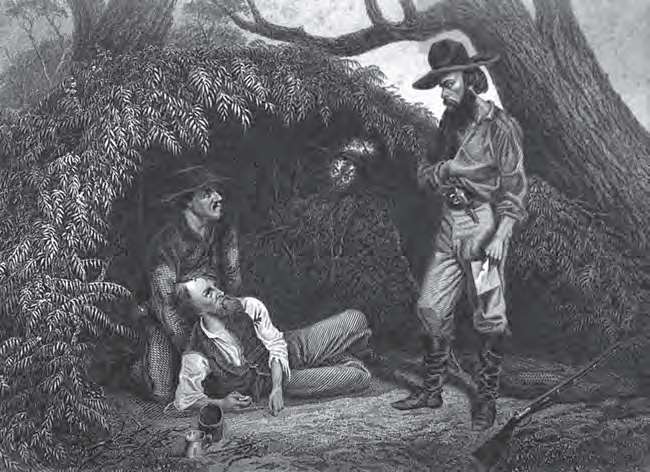 图3―2 一幅描绘伯克、威尔斯以及金在库珀河挣扎求生的绘画。斯科特·墨尔本创作,它是《威尔斯日记》(Wills, Wills, and Farmer 1863)中的插图