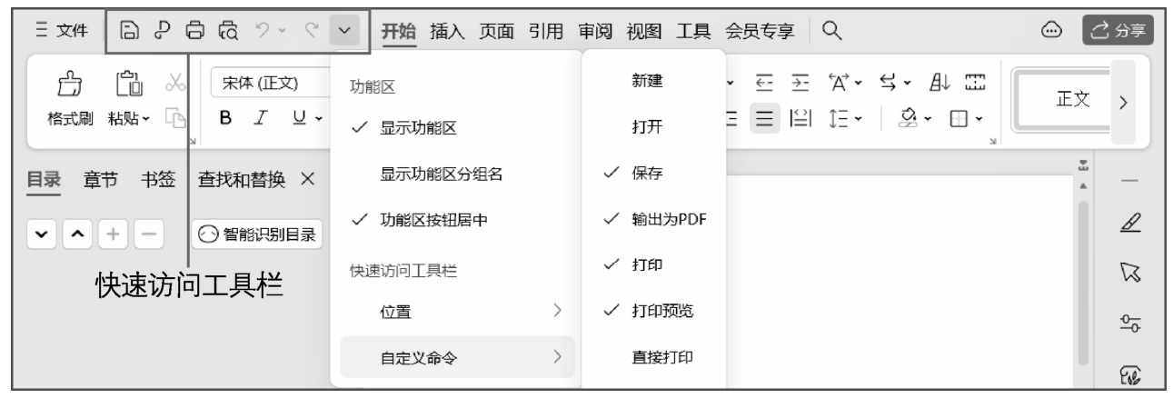 ,可以新建、保存、打开、关闭、输出或打印文件等。该按钮右侧的按钮组统称为快速访问工具栏,其中罗列了较为常用的工具按钮,以便快速实现对应的操作。单击快速访问工具栏右侧的下拉按钮