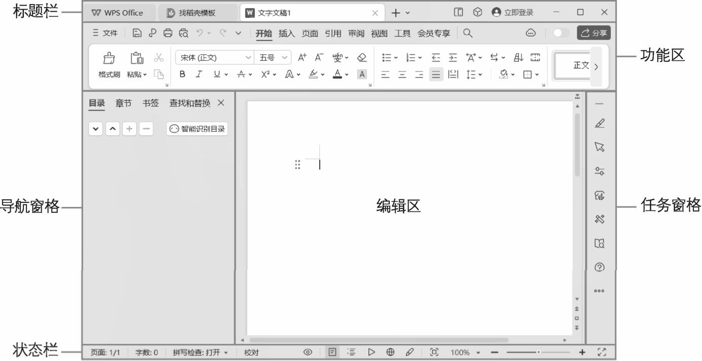 ,在打开的界面中选择“空白文档”,进入WPS文字的操作界面,如图1-1所示。该操作界面主要由6大部分构成,分别是顶部的标题栏、功能区,左侧的导航窗格,中间的编辑区,右侧的任务窗格,以及底部的状态栏。