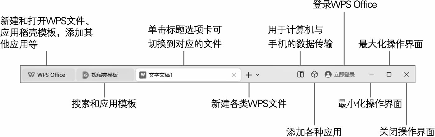标题栏位于WPS文字操作界面的顶部,可以用于新建或打开各种WPS的办公文件、应用模板,以及切换已打开的文档、调整操作界面的大小等,如图1-2所示。