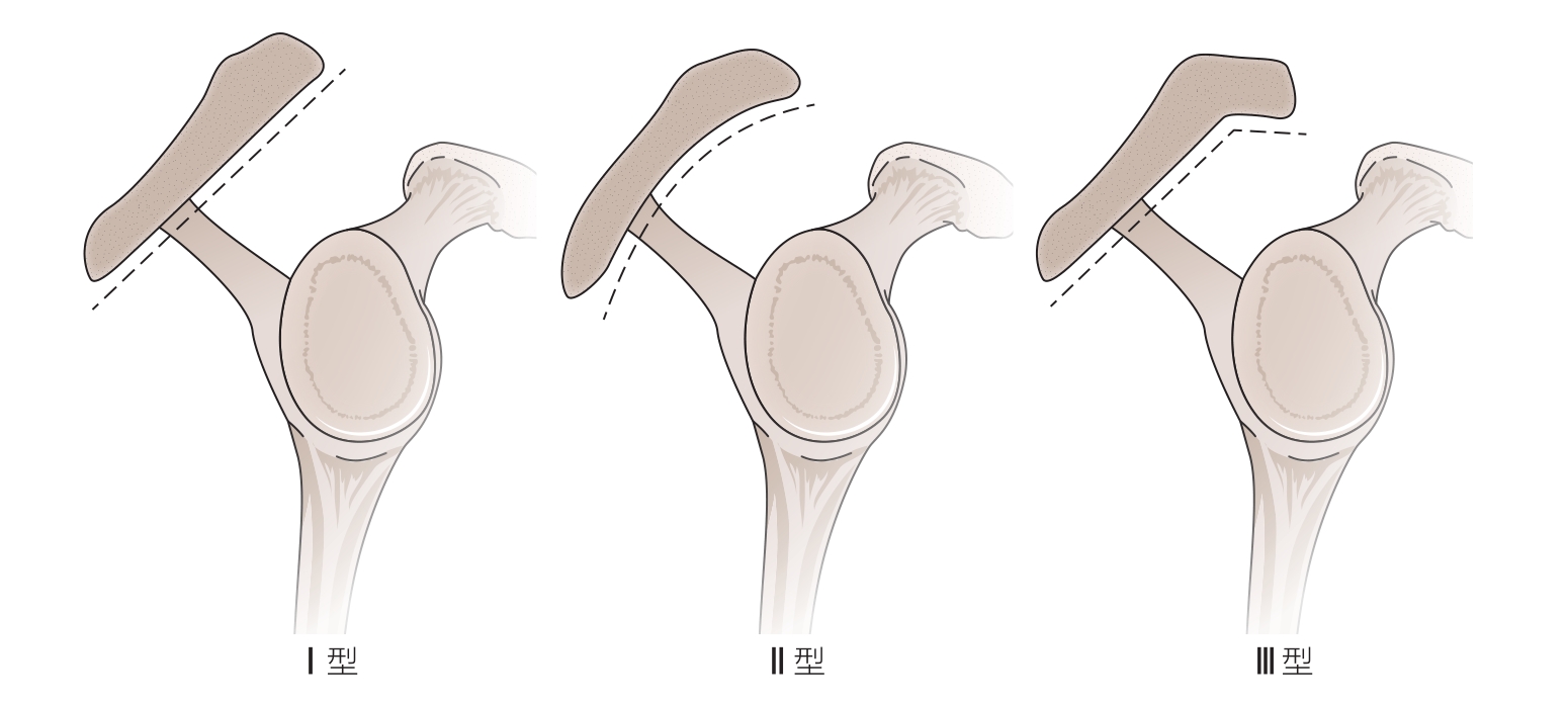由于损伤常涉及肩峰与肱骨头,研究人员对肩峰进行了广泛的研究。比利亚尼和同事(Bigliani et al.,1986)在研究中将肩峰的形状分为3型(图1.5)。Ⅰ型肩峰底面平坦,患肩峰下撞击综合征和肩袖损伤的风险较低。Ⅱ型肩峰底面呈弧状。Ⅲ型肩峰底面呈钩状,患肩峰下撞击综合征和肩袖损伤的风险较高。尼科尔森和相关人员(Nicholson et al.,1996)研究发现,肩峰的形状是先天决定的,不会随着时间而改变。肩峰有骨骺,有时不会融合,因此会导致肩峰畸形,通常称之为肩峰骨(Lieberson,1937)。