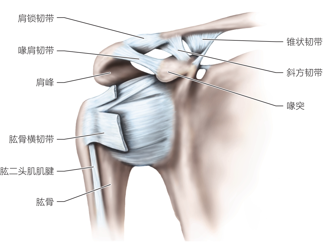 喙锁韧带包含两个部分:斜方韧带和锥状韧带。这两个部分在功能和结构上各有不同,但是在对应的边界上却是相同的。从前面看,韧带之间充满了脂肪组织以及常见的滑囊。滑囊也位于喙突和锁骨下表面之间。在高达30%的受试者中,这些骨骼可能会紧密对抗并形成喙锁关节(Dempster,1965;Frankel et al.,1980)。喙锁韧带将肩胛骨悬挂于锁骨上并将上斜方肌的力传递给肩胛骨(Dempster,1965)。