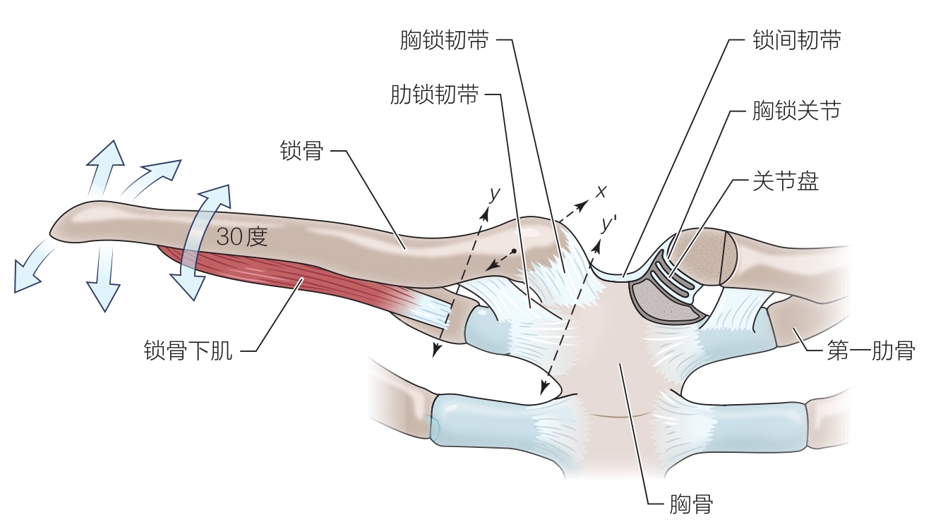 胸锁关节中,锁骨可进行上提和下降、向前和向后的运动,以及锁骨可沿着长轴旋转。这两种角度运动的轴都靠近肋锁韧带在锁骨上的附着点(Moore,1980)。