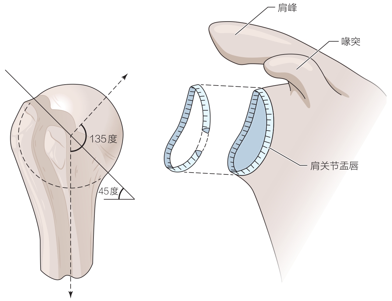 盂肱关节具有典型的不协调性特点,其表面不是对称的,并且有一个可移动的旋转轴。关节上的肌肉是关节保持稳定的基础(Moore,1980)。肱骨关节面的曲率半径为33~35毫米。肱骨头和肱骨颈可以形成一个130~150度的角,并且相对于肘关节横轴向后偏斜(后倾)20~30度(Norkin et al.,1983;Sarrafian,1983)。