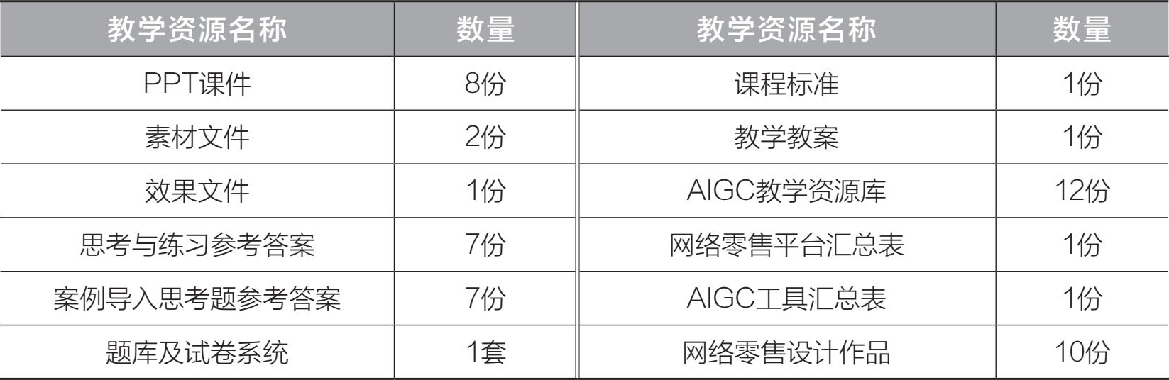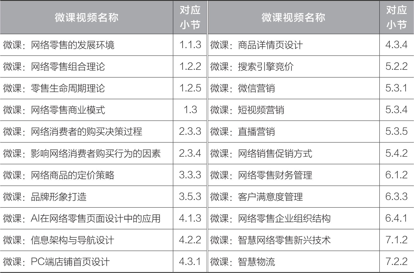 为了帮助读者更好地理解相关内容,编者针对网络零售的重难点知识录制了配套的微课视频,微课视频名称及对应小节如表3所示,用书教师如有需要,可在人邮教育社区联系本书责任编辑获取。
