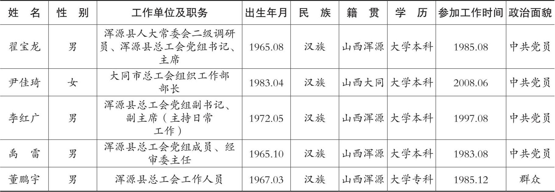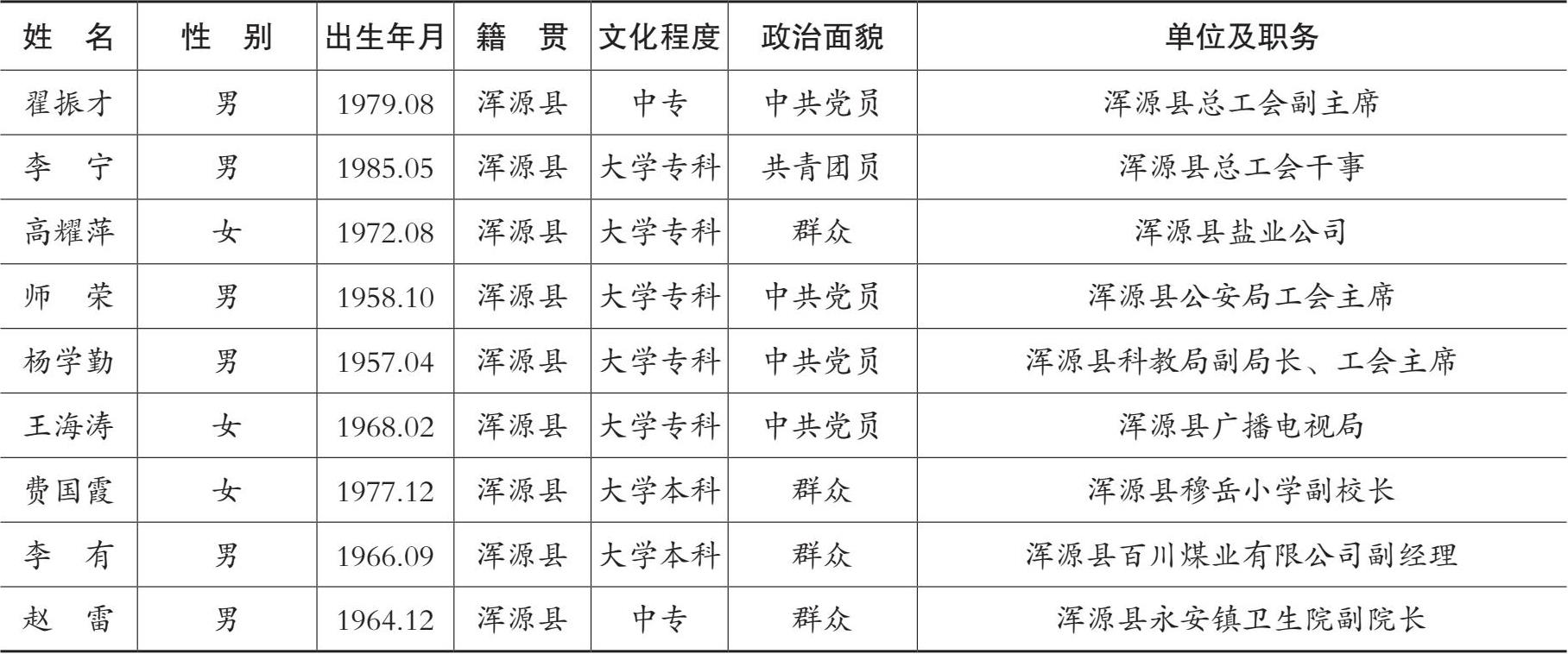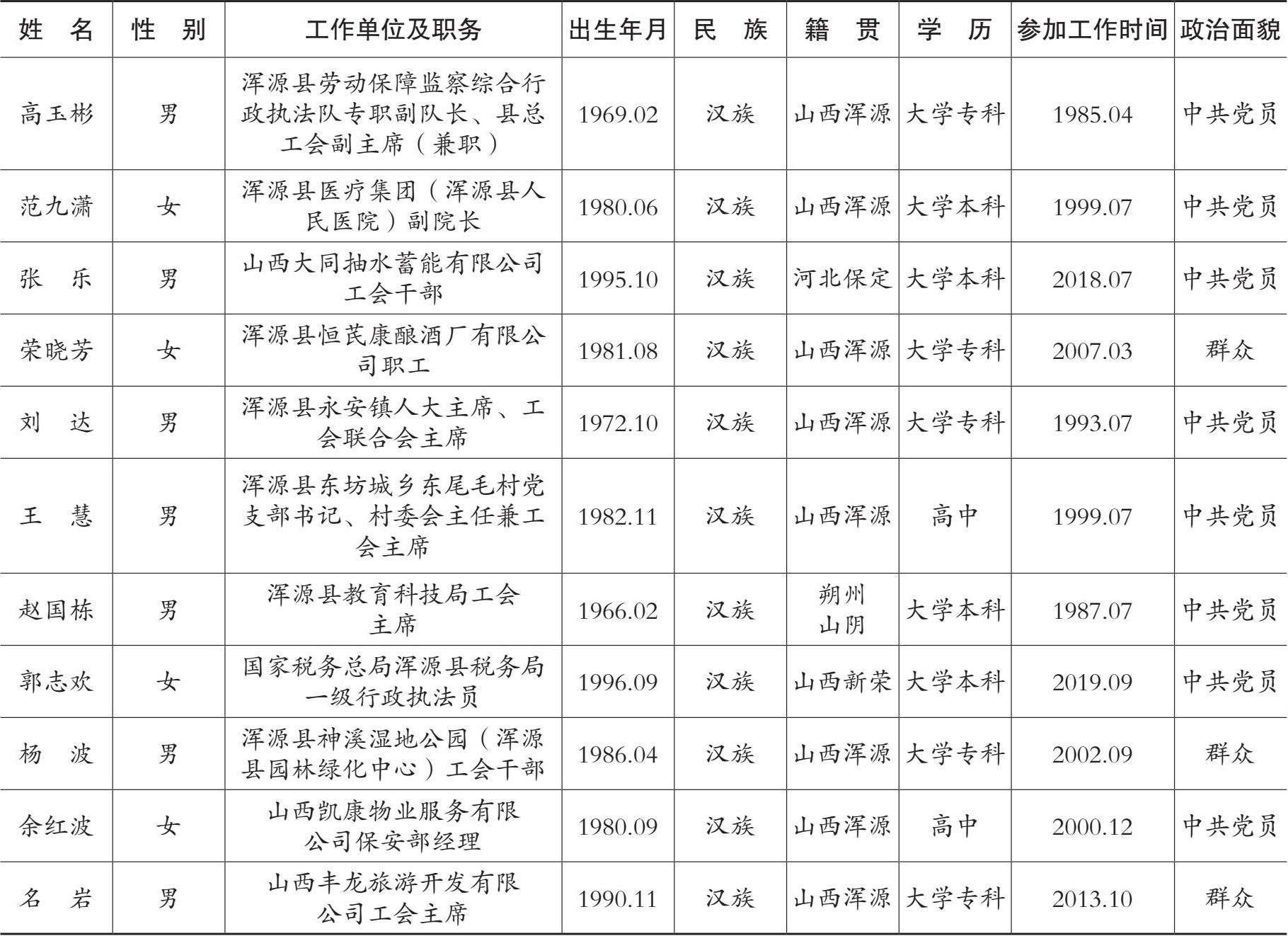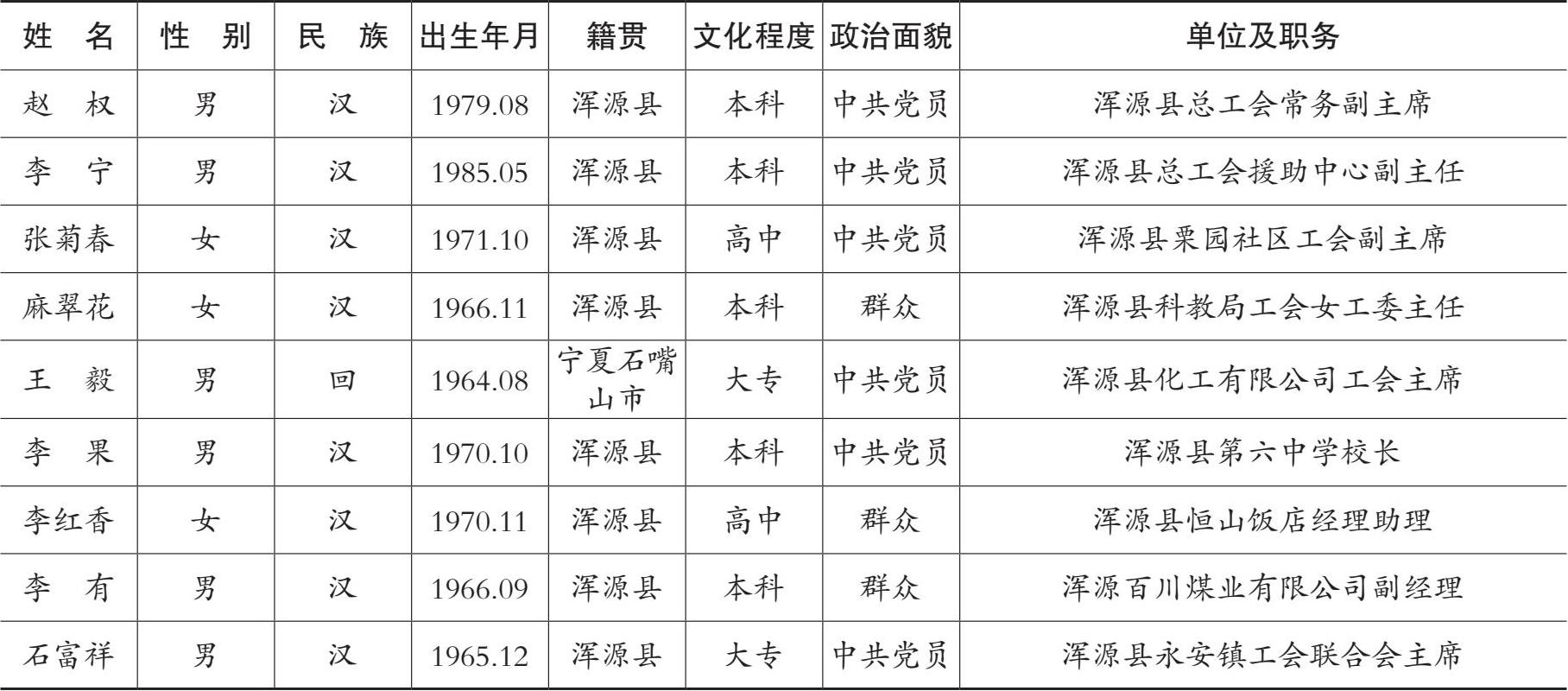 2014 年 2 月浑源县工会代表会上根据《中国工会章程》之规定,由全体与会代表以无记名投票的方式,一致选举赵权、李宁、张菊春(女)、麻翠花(女)、王毅、李果、李红香(女)、李有、石富祥等 10 人为大同市工会第十六次代表大会代表。