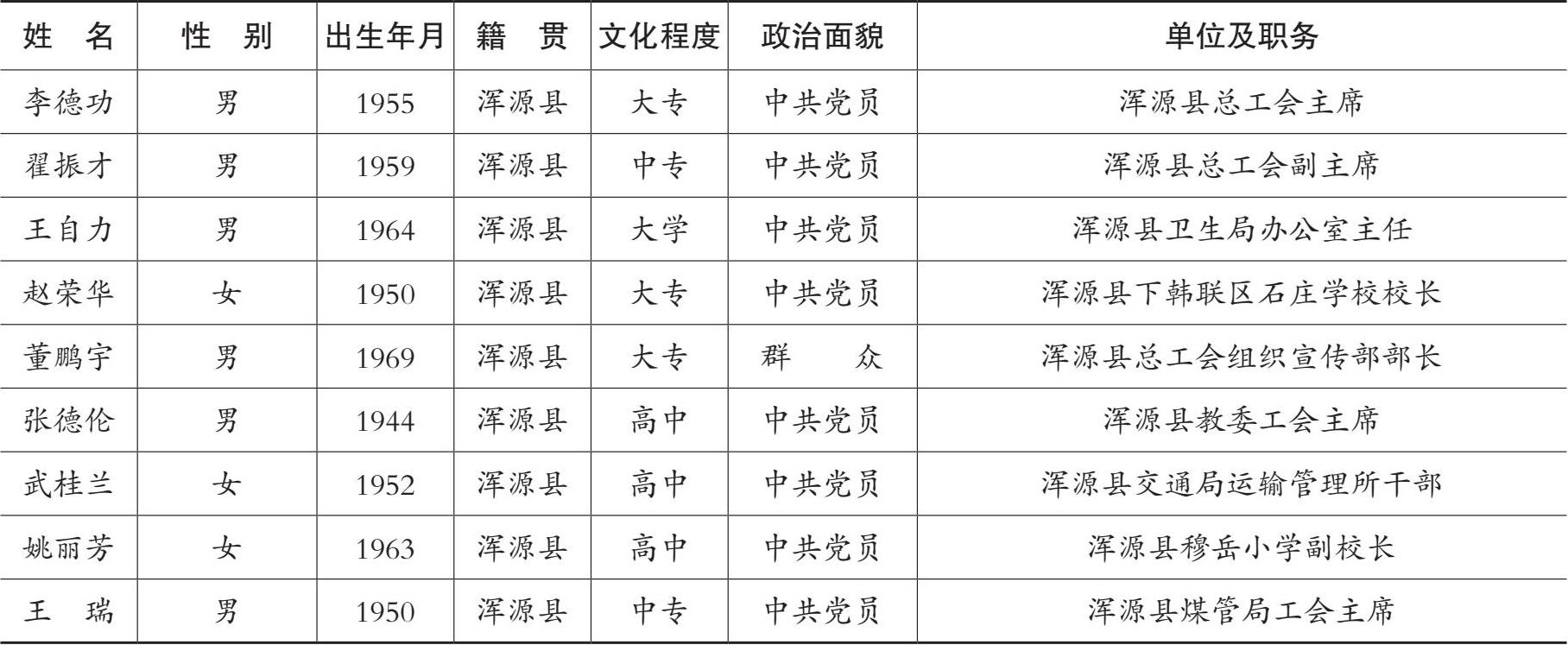 1999 年 7 月 28 日召开的浑源县工会第十四次代表大会第一次会议上,根据《中国工会章程》之规定,由全体与会代表一致选举李德功、翟振才、王自力、赵荣华、董鹏宇、张德伦、武桂兰、王瑞、姚丽芳等 9 人为出席大同市第十四次代表大会代表。