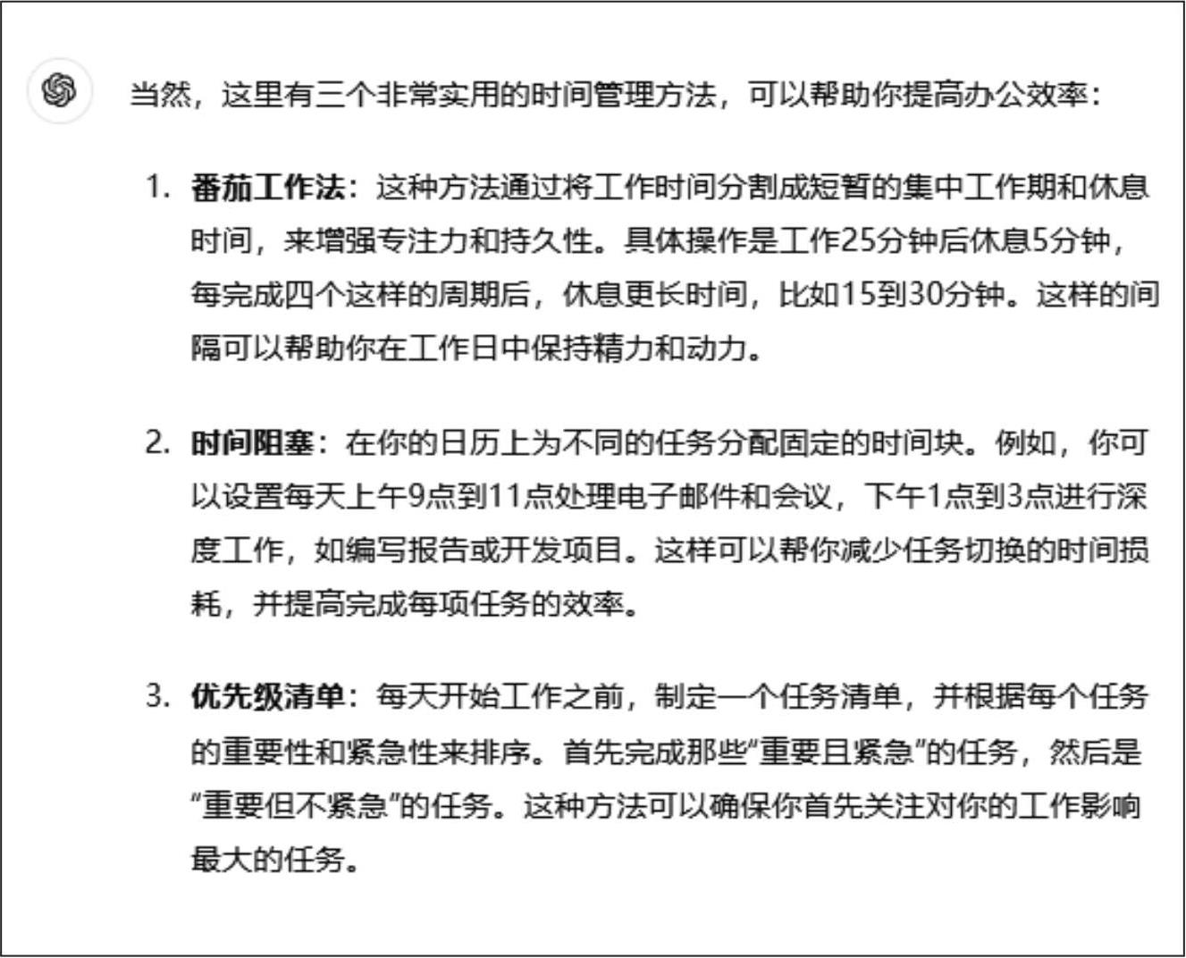 这个问题就非常宽泛,ChatGPT会给出各种方向的回答,包括但不限于减少干扰、合理休息、自动化常规任务、持续学习等方法。听上去都很有道理,但这些方法非常笼统,不是能直接操作的。