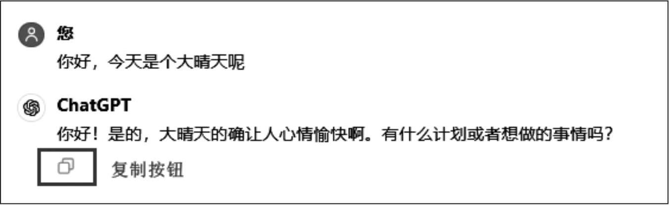 【操作 04】 与ChatGPT对话的过程中,如果遇到想要复制下来保存的内容,可以用鼠标选中聊天记录中的内容,右键进行复制,也可以直接点击图2-2中聊天界面提供的“复制按钮”,一键复制ChatGPT的回答内容。