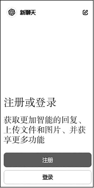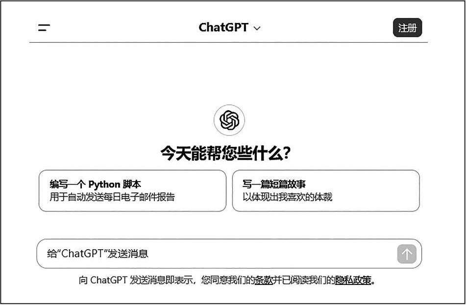 【操作 01】 进入ChatGPT的主页面,如图2-1所示,可以看到右上角有明显的“注册”入口,点击即可开始注册流程。