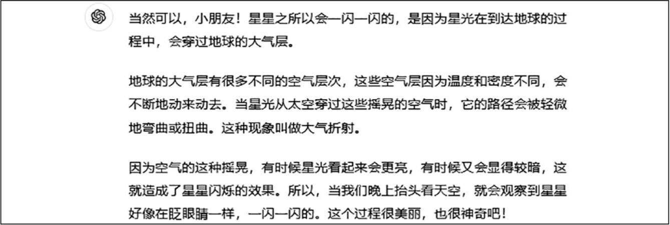 此时,ChatGPT会根据提问对象的身份,回答得相对简单,语气也更加活泼,如图2-12所示。