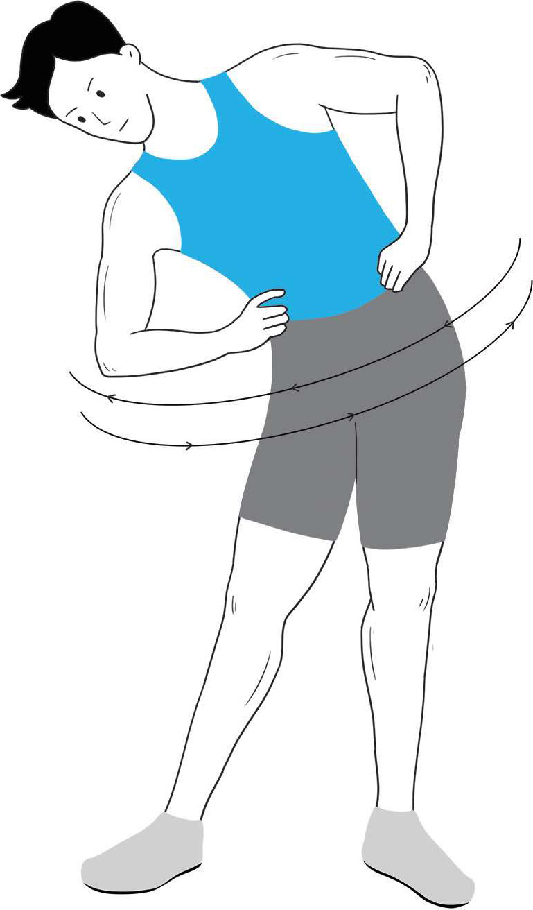 第二步,开始旋转,躯干从一侧开始旋转,感受腰椎的活动,以及腰部肌肉群的拉伸感。以腰部为轴心,让躯干画圆,在此过程中始终保持核心收紧,臀部等部位支撑稳定,不能随着躯干的转动而失去稳定性。旋转一圈回到初始位置后可停顿1~2秒,再开始第二圈。适当调整呼吸的节奏和频率,不要速度过快。完成5圈。