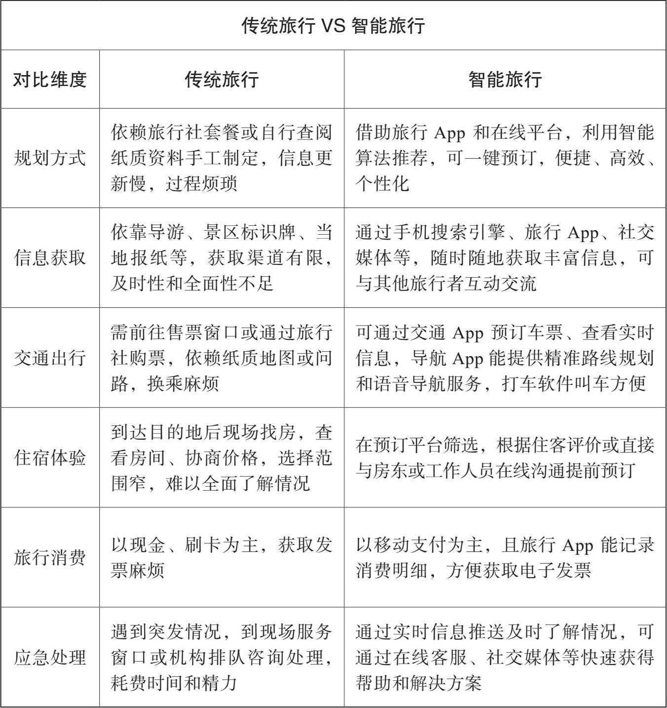 随着AI与旅行融合的不断加深,全球旅游科技市场规模取得不断突破,推动着智能旅行的不断发展,智能旅行模式正在改变人们的出行方式。它在规划方式、信息获取、交通出行等多个维度与传统旅行模式存在明显不同。具体如表 1-1 所示。
