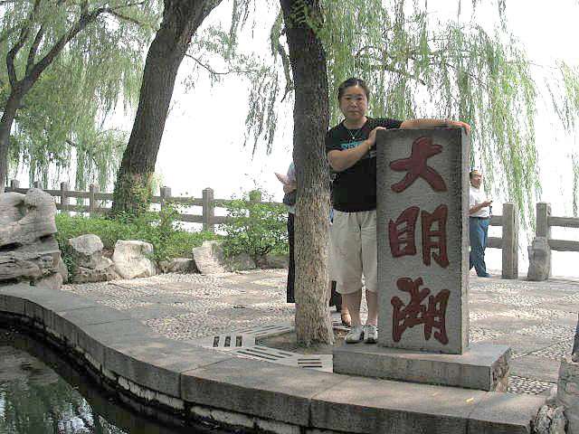 游船泛舟大明湖上,船到湖中心最大的历下岛,岛上绿柳环合,亭阁掩映,历下亭乃济南名亭之一,八角重檐,攒尖宝顶,红柱青瓦,斗拱承托,饰以吻兽,蔚为可观。亭东南侧有一古柳,据考已一百六十多岁,实在罕见。