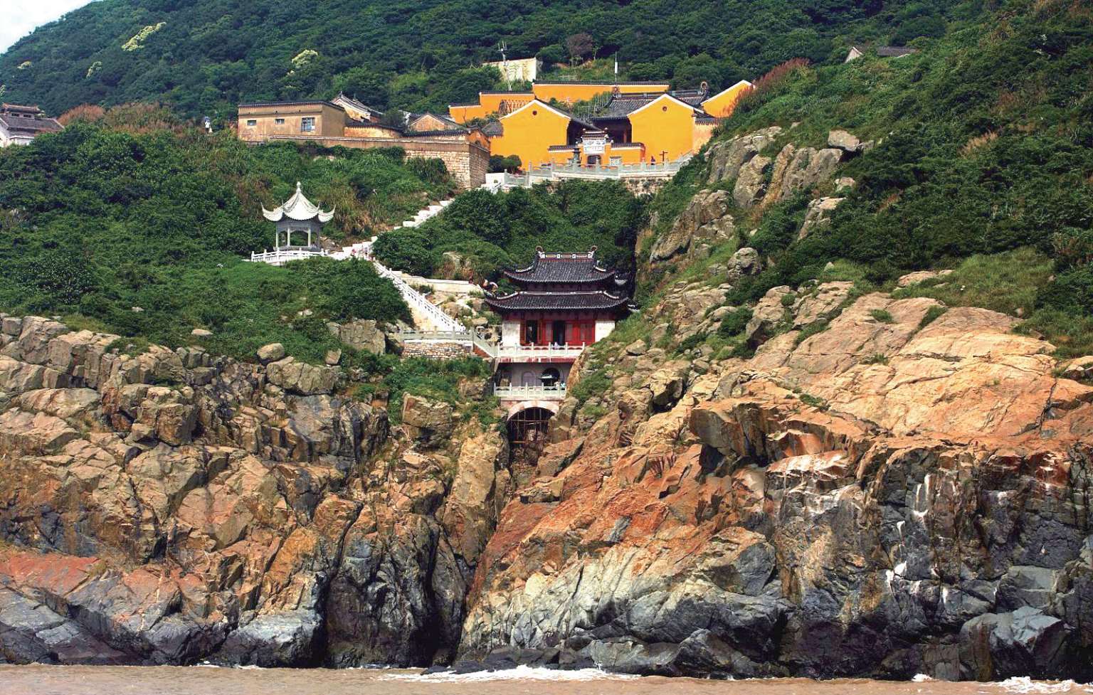 不肯去观音院:唐咸通年间,日本僧人慧锷从五台山请得观音佛归国,途经莲花洋,触礁受阻,由潮音洞旁登岸,在当地张姓居民住宅供奉,这就称“不肯去观音院”。古庵早废,1980 年在原址重建。